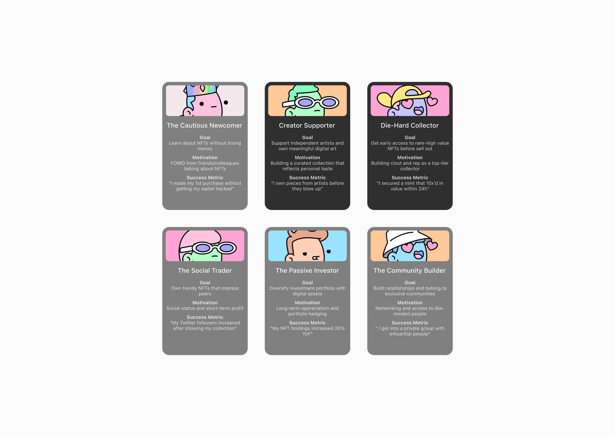 I advocated narrowing to one core segment (NFT Enthusiasts) and two primary use-cases. This meant deprioritizing casual buyers and experimental features, but it allowed us to go deep on the workflows that mattered most: connecting wallets and following artists for release notifications.